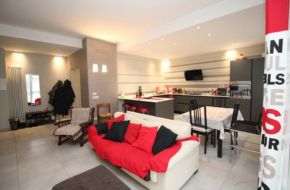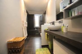 Il bagno è arredato in stile design moderno con doccia gigante a cristallo fisso e termoarredo contemporaneo. Particolare cura è stata prestata alla domotica: sistema di illuminazione indipendente a led/faretti, serrande elettrificate, impianto di allarme e predisposizione per aria condizionata.