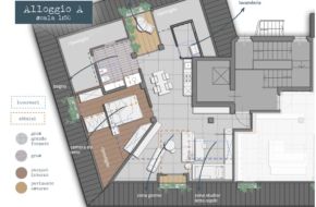 zona giorno, zona cucina/pranzo, 2 camere da letto, 1 camera studio, 2 bagni, spazi ripostiglio nelle zone non abitabili.